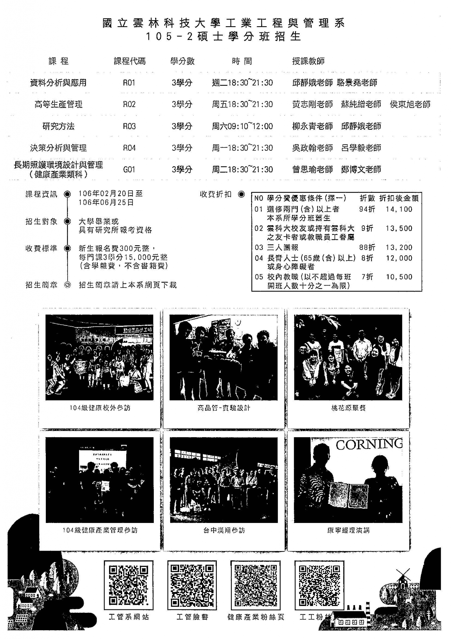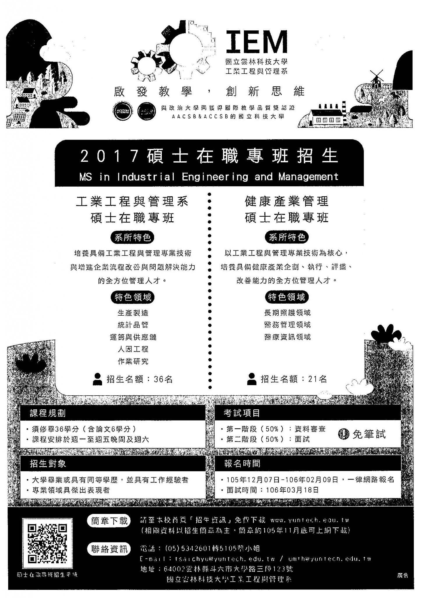 國立雲林科技大學106學年度「工業工程與管理系碩士在職專班」、「健康產業管理碩士在職專班」、「105學年度第2學期碩士學分班」開始招生囉!