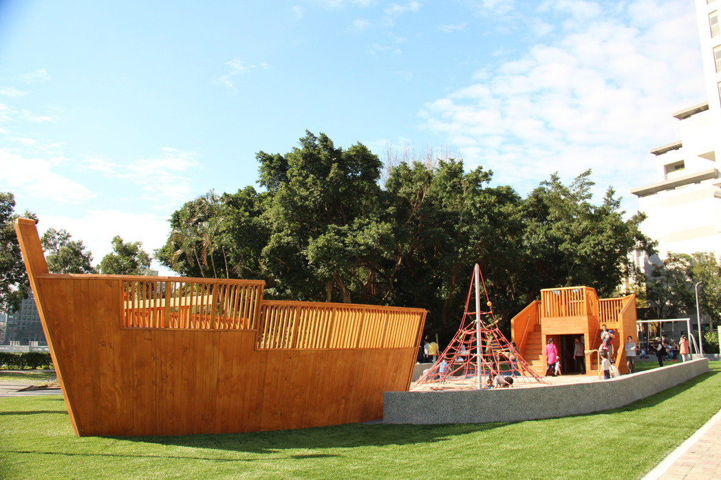 碧湖公園新打造的巨型木造海盜船兒童遊戲場。圖/公園處提供